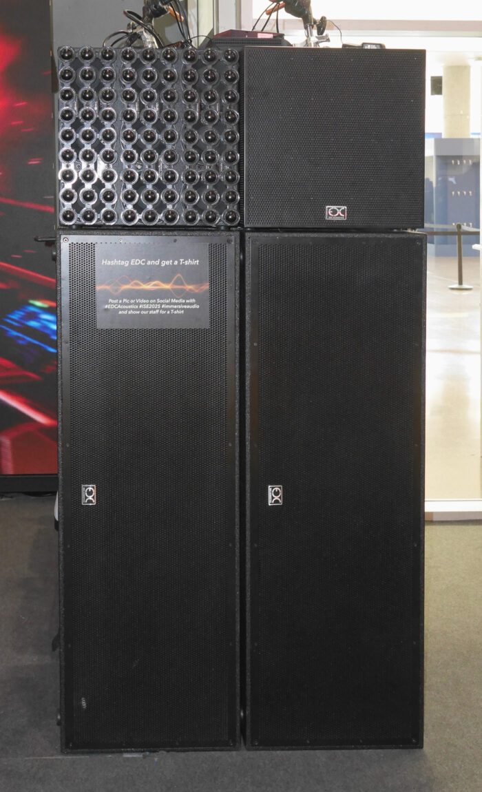 EDC stellte jedoch auch auf der ISE in 2025 aus, wo das oben stehende Foto eines Arrays aus EDC-Lautsprechermodulen entstand. Das EDC-Konzept basiert auf einem flexiblen Beamforming-Konzept, das auf skalierbaren Lautsprecherarrays aufsetzt, um mit Funktionen wie Multi-Beam-Steuerung und asymmetrischer Energieverteilung eine präzise, gleichmäßige Abdeckung in jeder Umgebung zu ermöglichen. Über eine web-basierte App ist das Abstrahlverhalten der Arrays optimierbar, um die EDC-Lautsprecher selbst an akustisch anspruchsvollste Räume anzupassen. Die Algorithmen optimieren den Frequenzgang, steuern die Energieverteilung präzise und eliminieren Reflexionen und Kammfilterung, so dass das Publikum praktisch überall im Raum das gleiche Hörerlebnis haben kann.