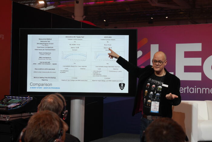 Zuvor hielt Merlijn van Veen auf dem Speakers Corner einen Vortrag, der tiefer auf die AES75-Details einging. In der späteren Paneldiskussion gab es auch auch eine kurze Zusammenfassung der Grundlagen und Neuigkeiten. Danach ging es in einem offenen Diskurs darum, wie man gemeinsam die inflationären max. SPL Angaben in manchen Datenblättern und Ausschreibungstexten stoppen und dem zwar überaus bekannten, aber von Systemingenieuren oft ignorierten Parameter wieder etwas mehr Sinn geben könnte.